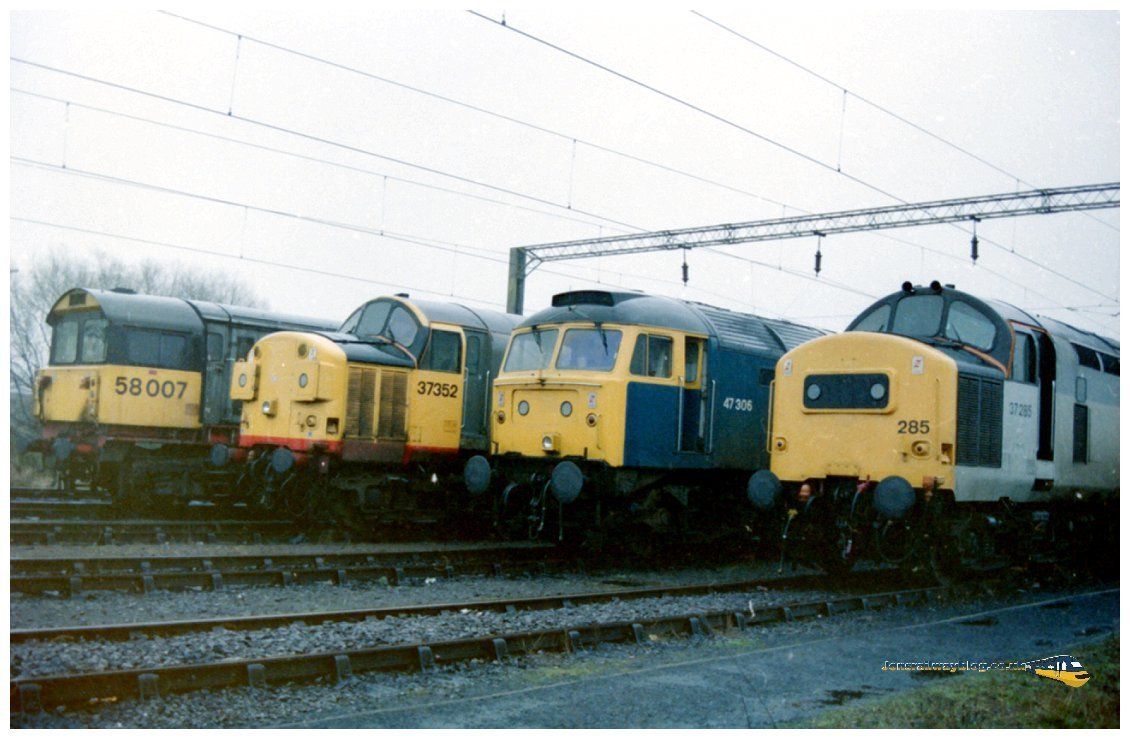 Saturday's at Bescot were a great opportunity to see a wide variety of motive power. Here we can see a classic line up, only 3 different types of loco on this one. 58007, released from Doncaster works 09/12/1982, named Drakelow Power Station 25/08/1990. Transferred to France 14/10/2014, it is now stored in Alzay in France, with an uncertain future. 37352, released from the Vulcan foundry as D6708 10/02/1961, renumbered 37008 March 1974. wandered around the network for many years, renumbered again to 37352 17/06/1988. renumbered back to 37008 06/07/1989, unfortunately 37008 was involved in a collision with an empty freightliner rake at Seabrooks Sidings while working 4S83 1830 Tilbury - Coatbridge with 37225. After the accident 37352 awaited its fate at Stratford Depot, officially withdrwan from stock 24/02/1992, moved to Tinsley 31/01/1993. Finally taken to MRJ Phillips at Crewe 21/07/1996. 47306, released from Brush Locomotive works as D1787 26/11/1964. One of 512 built, renumbered 47306 in April 1974. One of the lucky ones, it is currently undergoing refurbishment at the Bodmin Heritage Center, dispite having a fire in the wiring system, should be running under its own power once more, if it is not already doing so. 37285, released from English Electric Vulcan Foundry as D6985, Based at Canton. Renumbered to 37285 in March 1974. As with most other locos, moved around the network until 1993, stored serviceable 27/01/1993. returned to traffic at Tinsley, 31/03/1993. until stored unserviceable 15/08/1994. Renumbered to 37335 02/09/1994 and returned to Immingham as a stored Locomotive and components striped. Condemned 30/07/1999 and then cut up by Raxstar at Immigham MPD. More information on Class 37's can be found by clicking on the link below. https://www.class37.co.uk/default.aspx